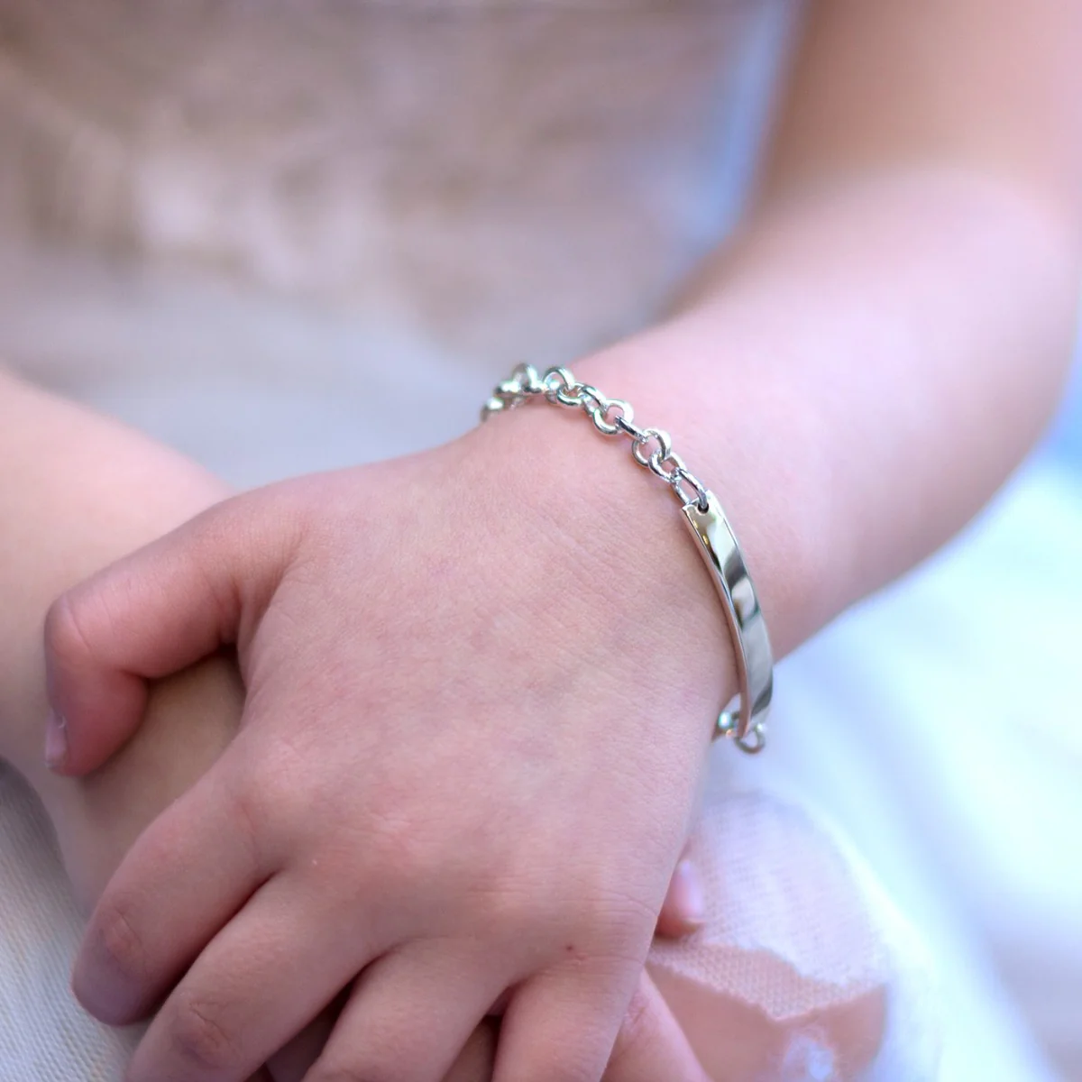 Perfect for both boys and girls, this classically designed bracelet is made of silver chain links, with a plain solid silver bar in the middle, and is secured with a silver lobster claw clasp.