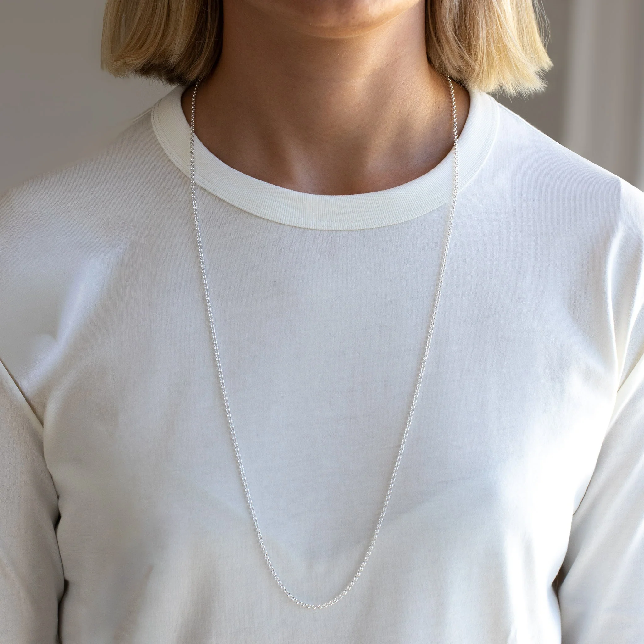 This extra-long sterling silver chain measures 31" and extends to 33" (78-83cm). It features uniform oval links connected in a repeating pattern, forming a classic and versatile cable (trace) chain.