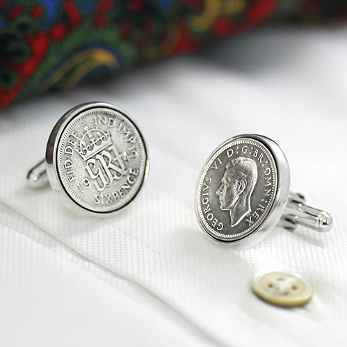 Sterling silver cufflinks set with authentic sixpenny pieces, a traditional symbol of good fortune.