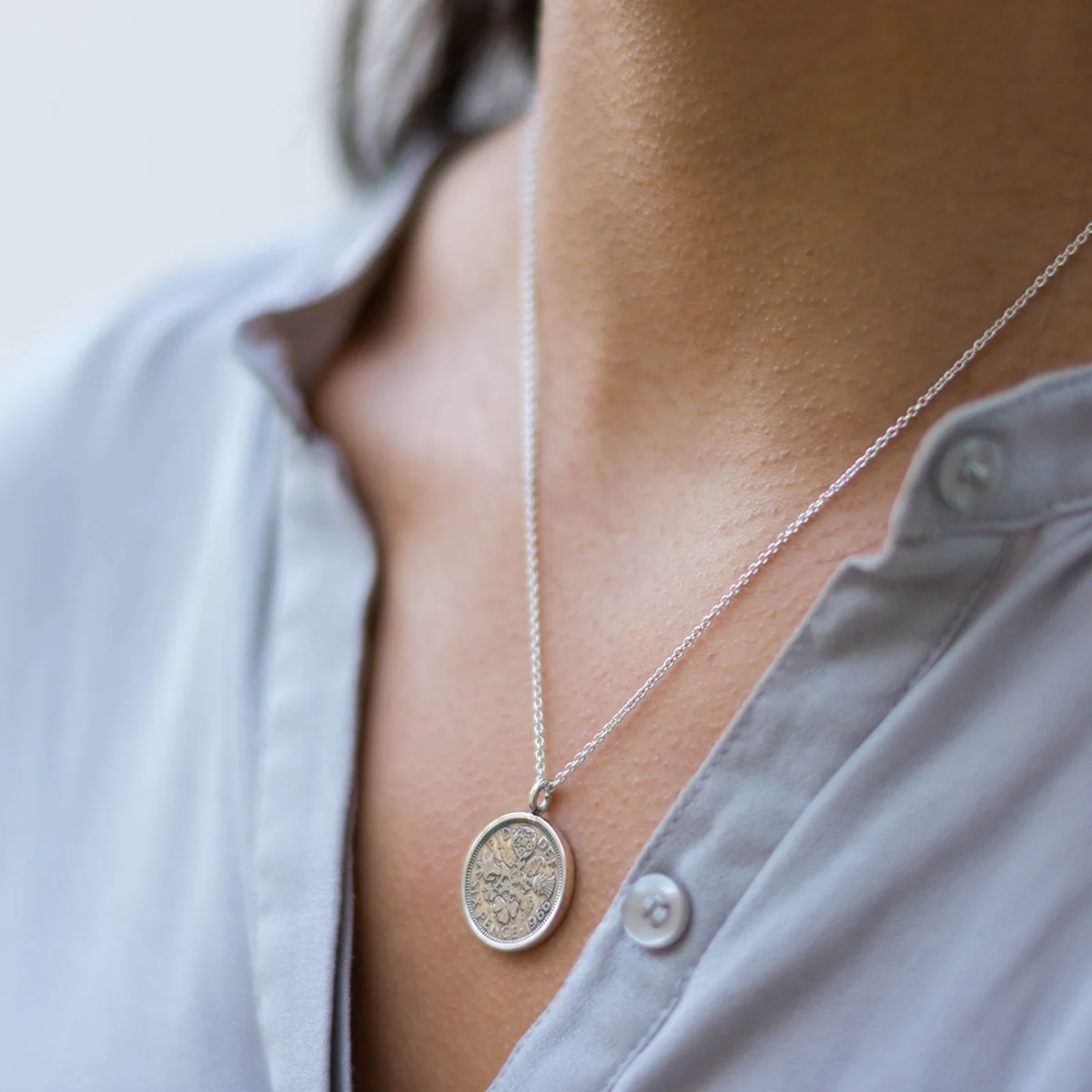 Each necklace features a genuine used sixpence dated between 1921 and 1967. Pre-1947 coins are more valuable due to their silver content. Every coin is unique and carries its own history.