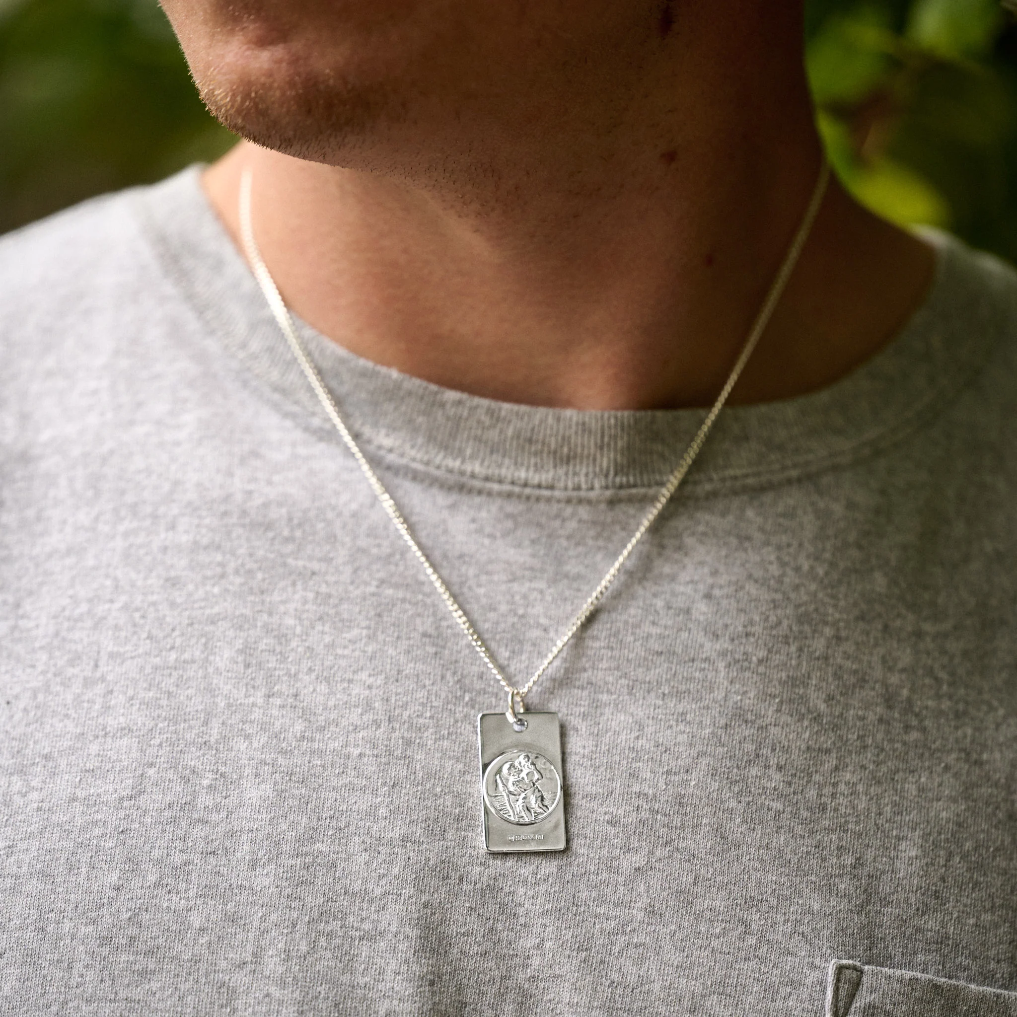 This sterling silver necklace features a circular St. Christopher motif on a rectangular background.