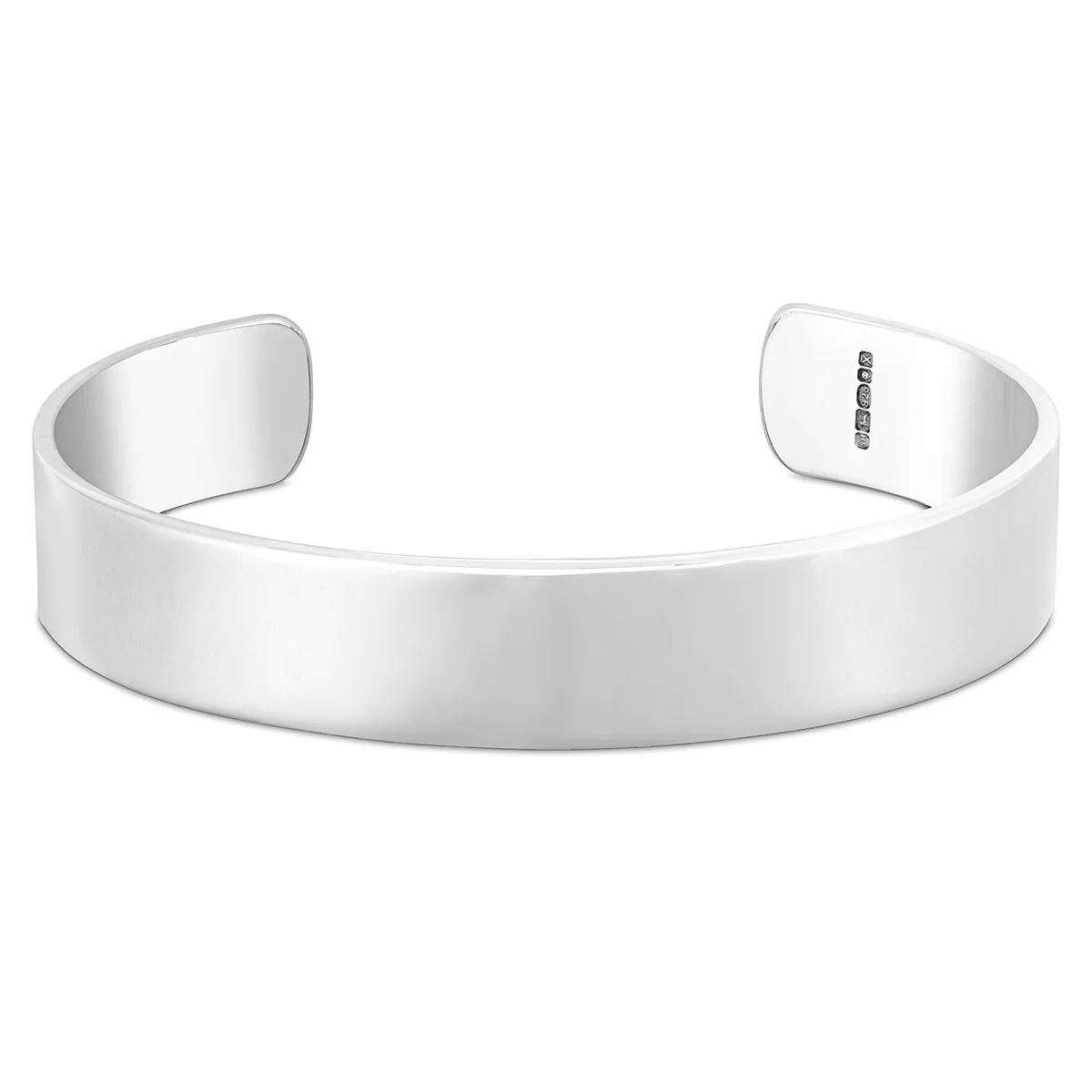 Made from solid sterling silver and fully hallmarked at the London Assay Office. The cuff measures 13mm wide and 1.6mm thick, making it a durable everyday accessory.