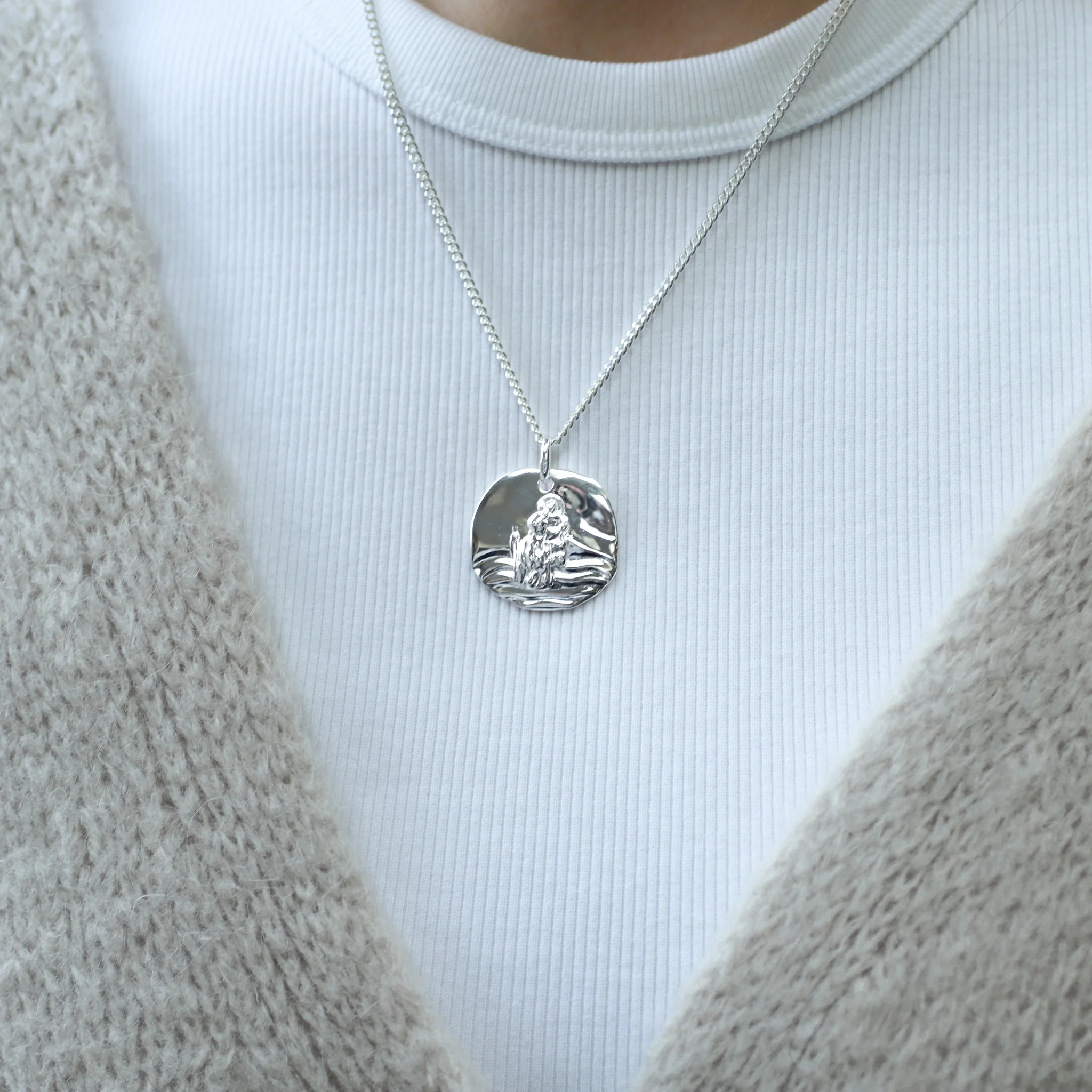 This Molten St. Christopher necklace features an irregular, organic outline inspired by the smooth surface of a washed-up pebble. Substantial in weight and satisfyingly tactile, the medal measures 23mm across and carries a soft St. Christopher design at the centre.