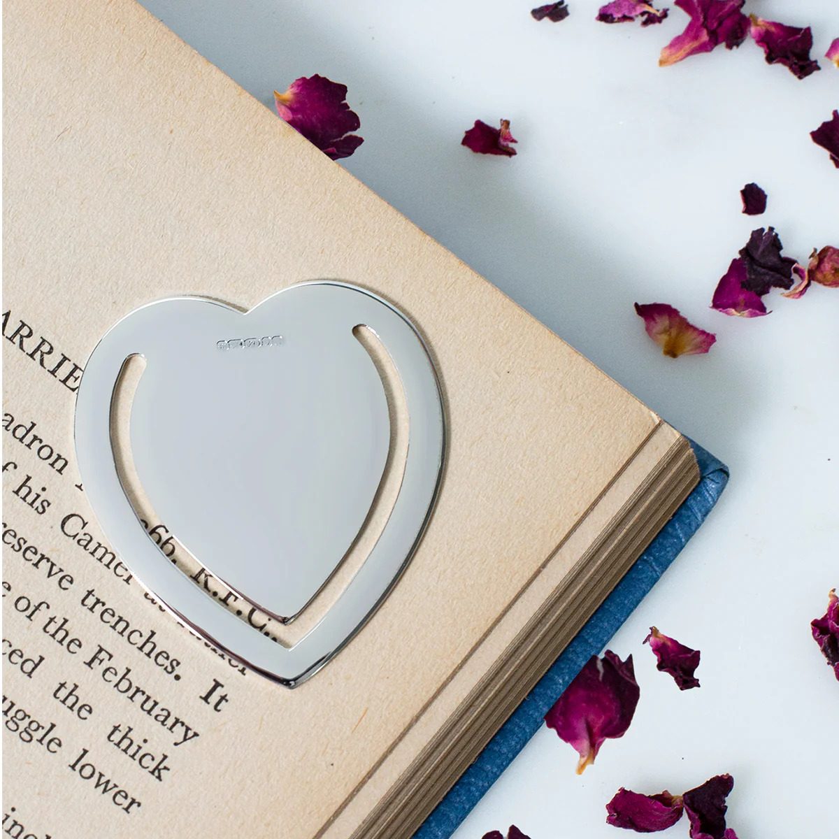 Solid sterling silver heart-shaped bookmark, handmade in our workshop. Suitable for engraving a name, date, or short message.
