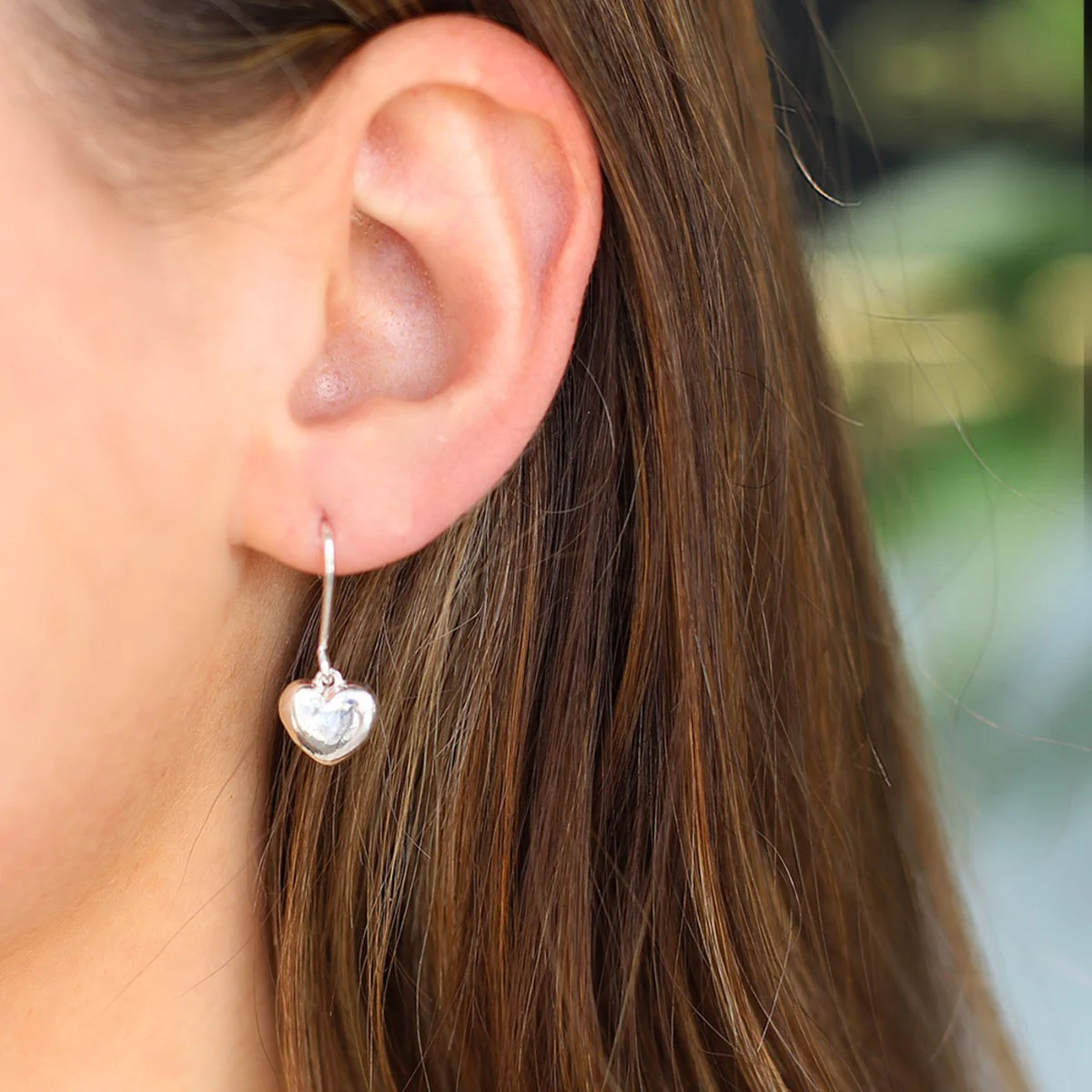 Sterling silver drop earrings featuring a 9mm heart on a 22mm drop from the hook.
