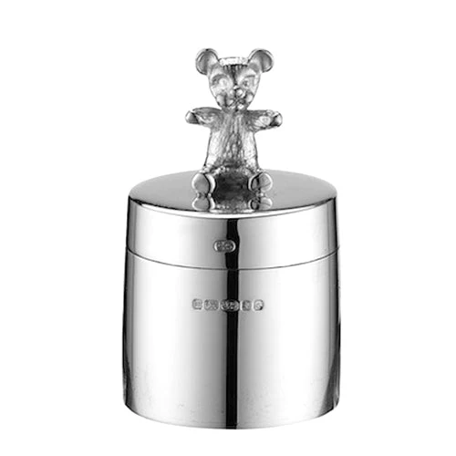Sterling silver tooth box with a cast teddy bear on the lid, an ideal keepsake for a baby’s first tooth or special occasion.