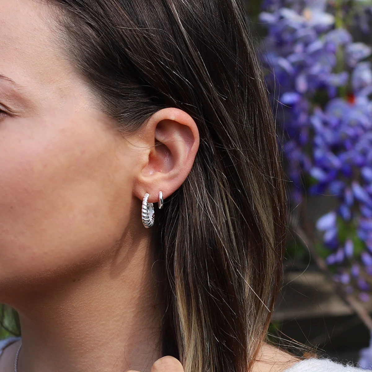 Chunky sterling silver hoop earrings with a twisted design for a three-dimensional look.