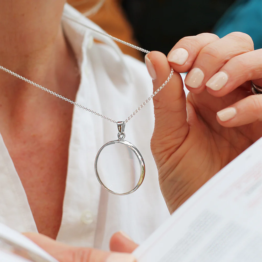 Handmade sterling silver magnifying glass pendant, 33mm in diameter, perfect for reading small print.