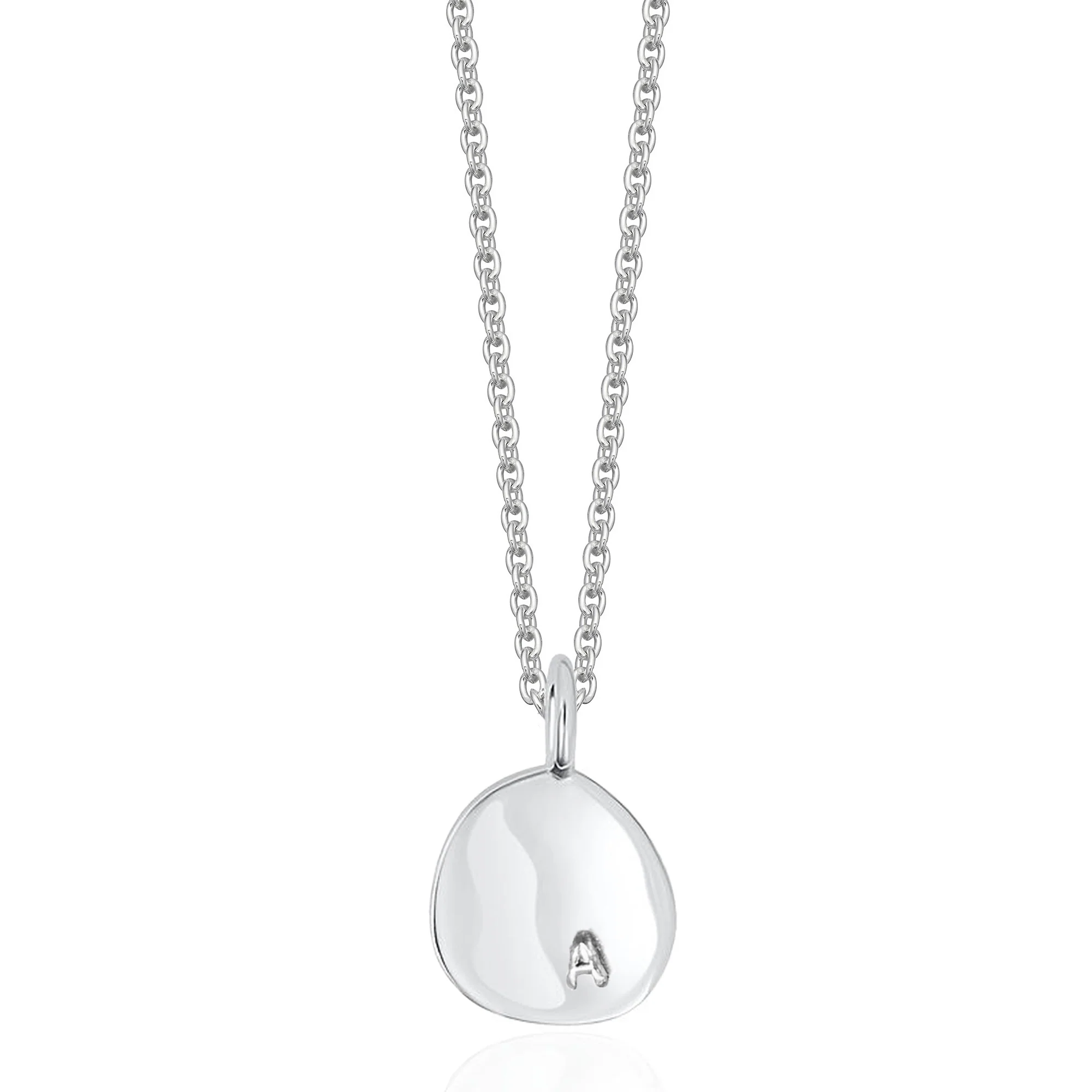 Sterling silver molten pendant with a smooth polished finish. Choose a chain length to suit. This pendant can be stamped by hand with up to two initials. These will be placed diagonally from one another. Please note that due to the hand finished nature of this product, the placement of the initials may not be perfectly centered.